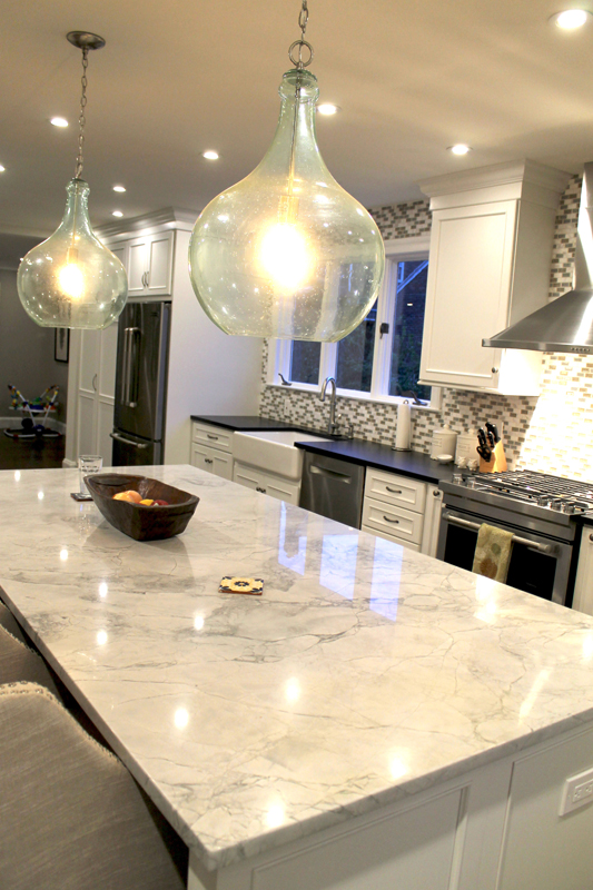 kitchen, kitchen remodeling, marble kitchen island, gas range stove, farmhouse sink, glass light fixtures